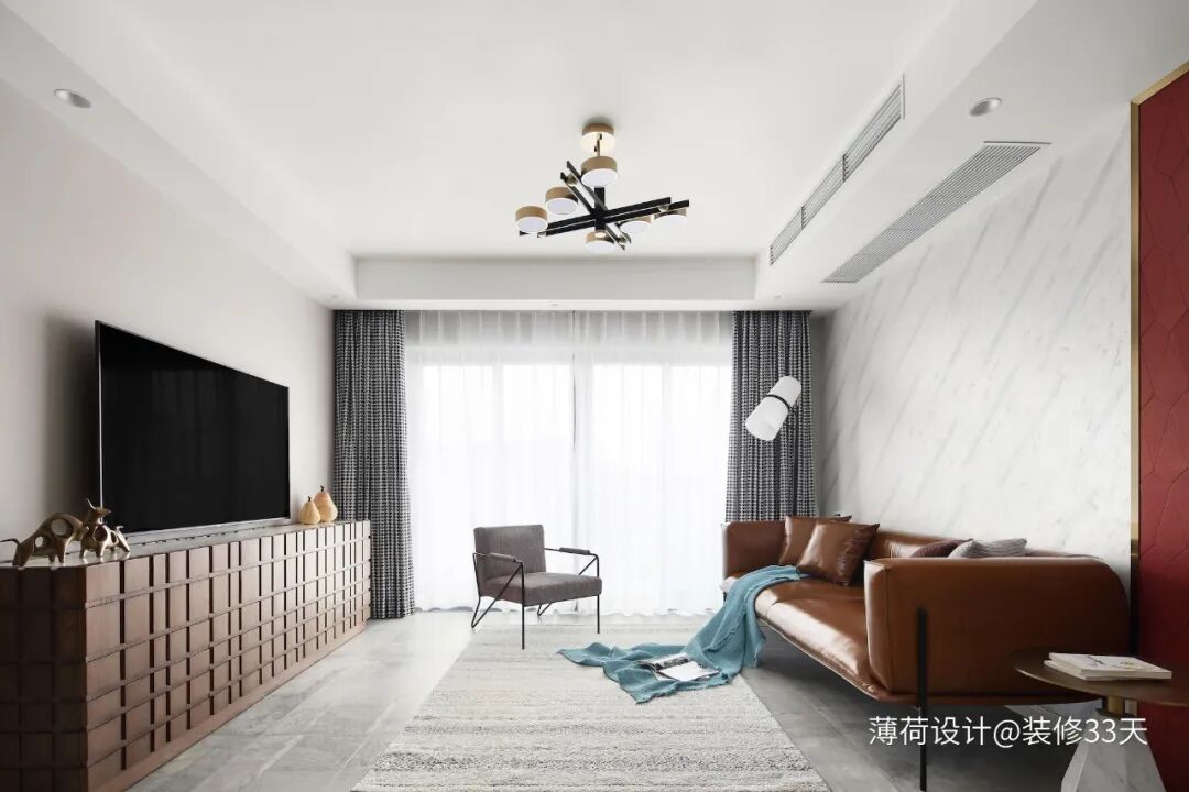 ▲ 客厅地面通铺灰色调地砖,顶面做一圈功能性吊顶来布置筒灯和空调内机,电视柜用了一组超大的落地柜,收纳能力很强