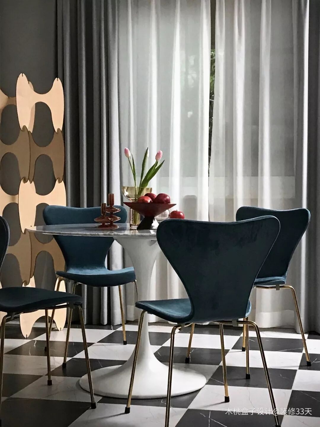 ▲ 餐厅地面铺贴黑白相间地砖,直径1.1米的圆形餐桌足以满足一家人就餐