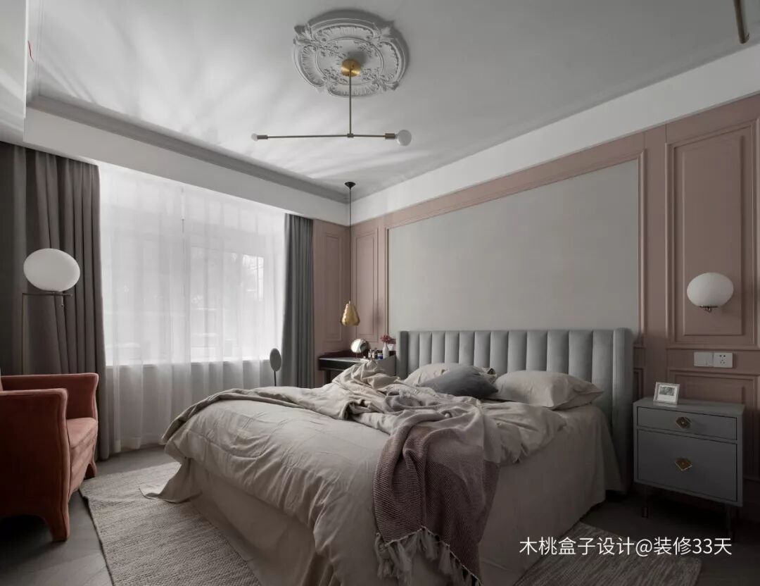 ▲ 主卧温馨浪漫,以灰色和脏粉色为主,局部点缀金色,增加质感