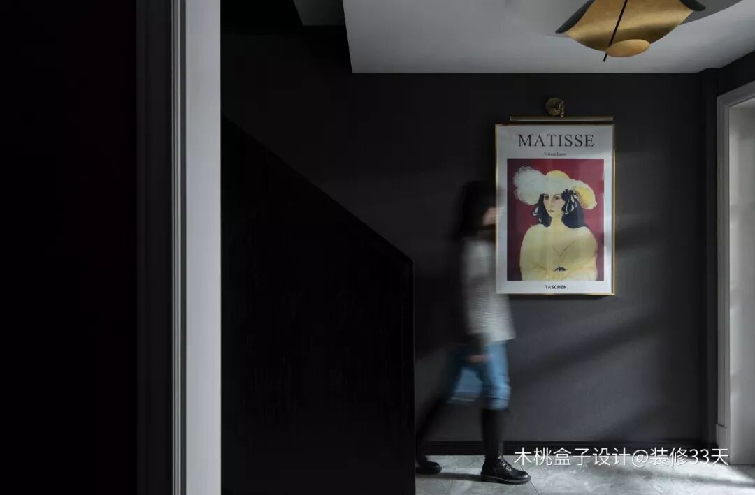 ▲ 负一层主要是男主的教学空间和休闲区,走下楼梯的区域,黑色墙面通过装饰画点缀