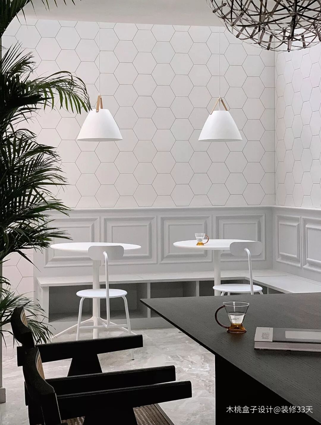 ▲ 利用原来的天井处,打造卡座休憩区,墙面铺贴白色六角砖