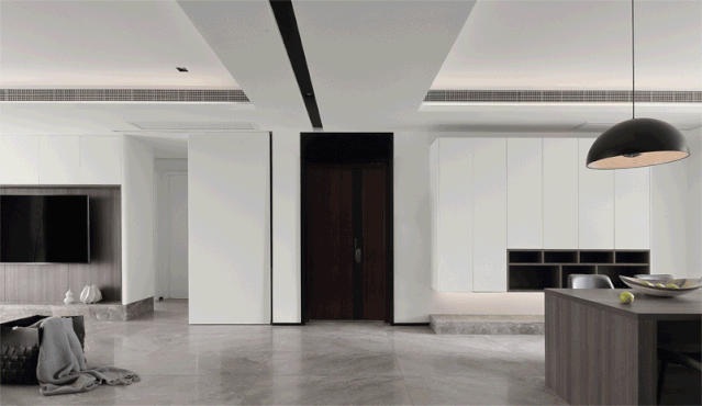 ▲ 一举两得的移门兼柜门设计将客厅和次卧空间自然分割,也让电视背景墙更加整体,作为侧面柜门时,卫生间便纳入公共空间当客卫使用