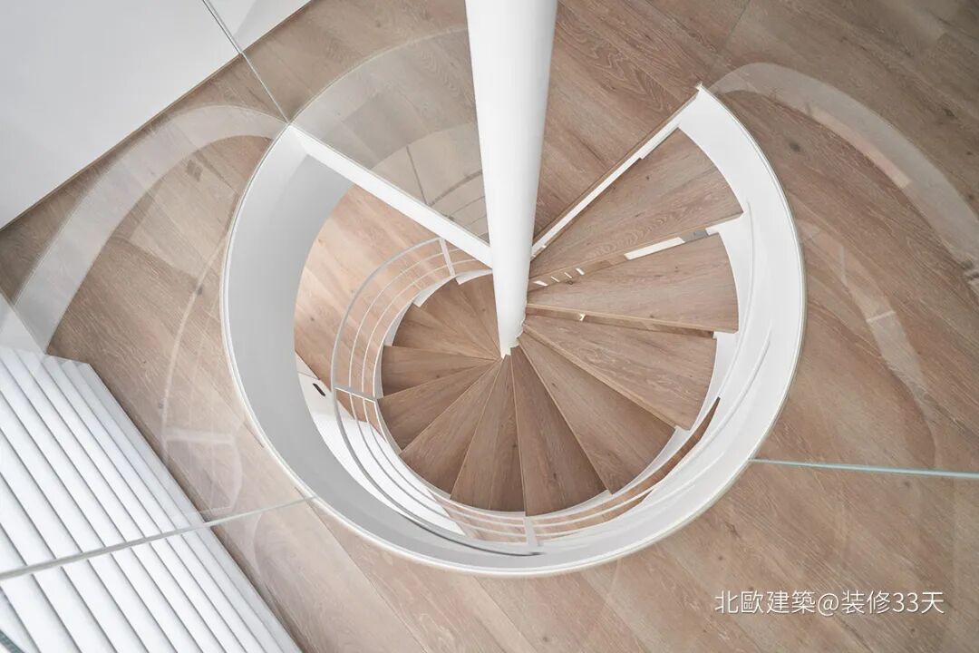 螺旋楼梯的踏步是围绕着一根立柱布置的,流线造型非常美观,总体占地面积较小。