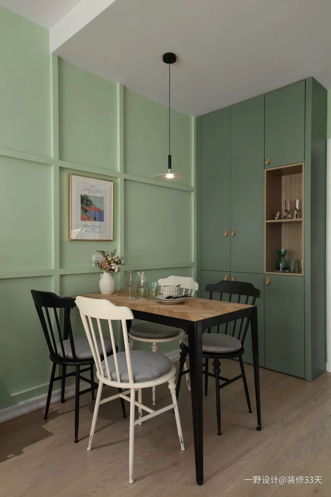 ▲ 餐桌椅靠墙放置,餐边柜与鞋柜结合一体,柜门采用了比背景更深一些的绿色,与背景区分开来,但不破坏整体性