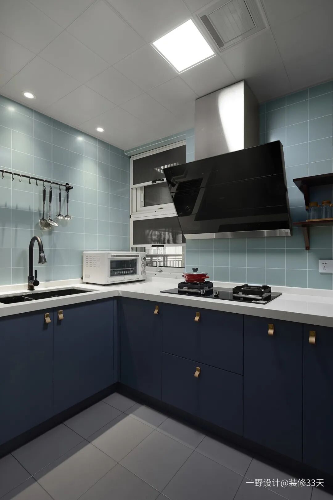 ▲ 厨房不用吊柜更显宽敞,浅蓝色墙砖搭配深蓝色地柜,富有层次感