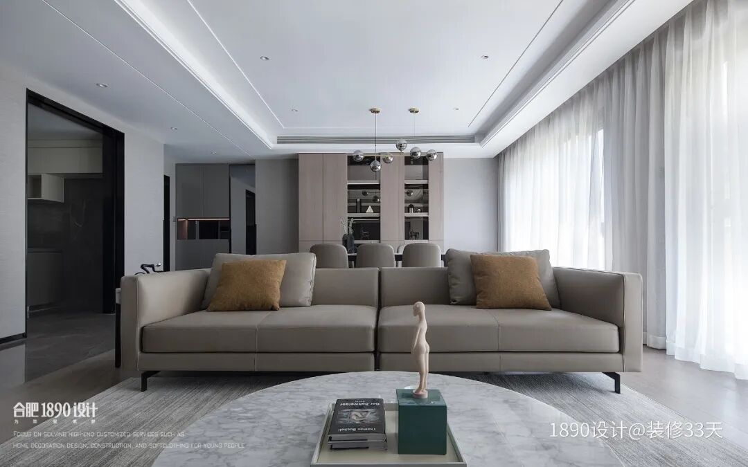 ▲ 灰色皮沙发搭配大理石茶几,极简顶面延伸至餐厅,白色纱帘的褶皱在阳光照射下更具层次
