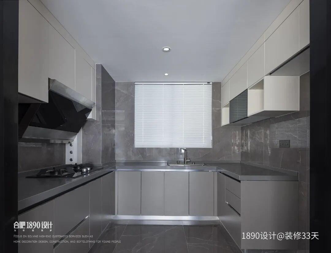 ▲ 厨房U型布局,通铺灰色瓷砖,橱柜采用上下分色,吊柜局部留空满足不同收纳需求