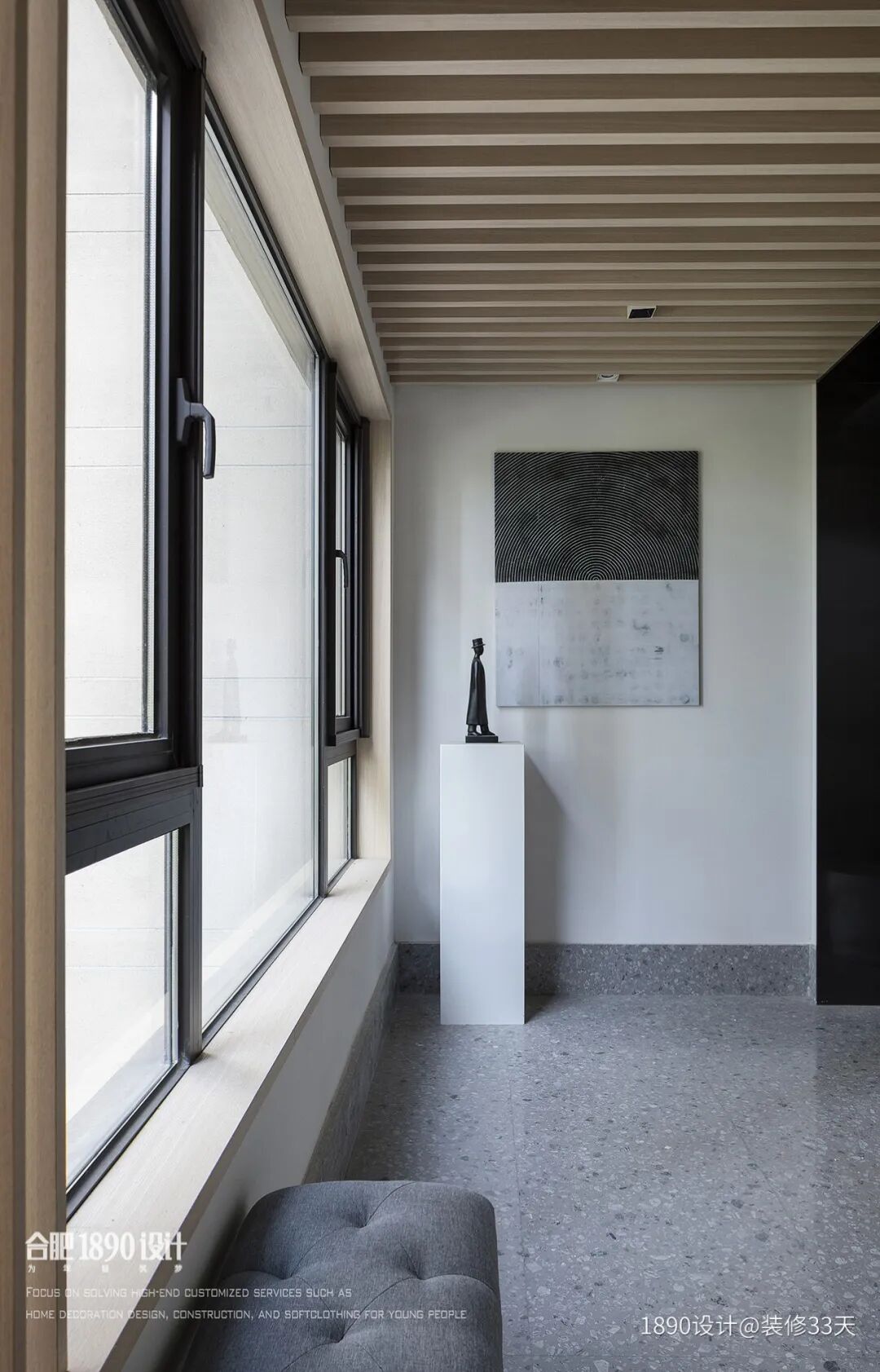 ▲ 玄关采光良好,水磨石地面搭配原木格栅吊顶,显得清爽文艺