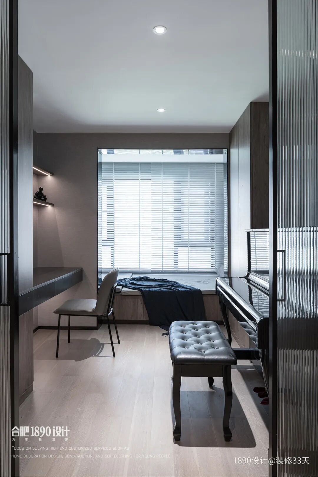 ▲ 书房纳入阳台定制榻榻米,增设钢琴、书桌与柜体,打造成集卧室、收纳、娱乐于一体的多功能空间
