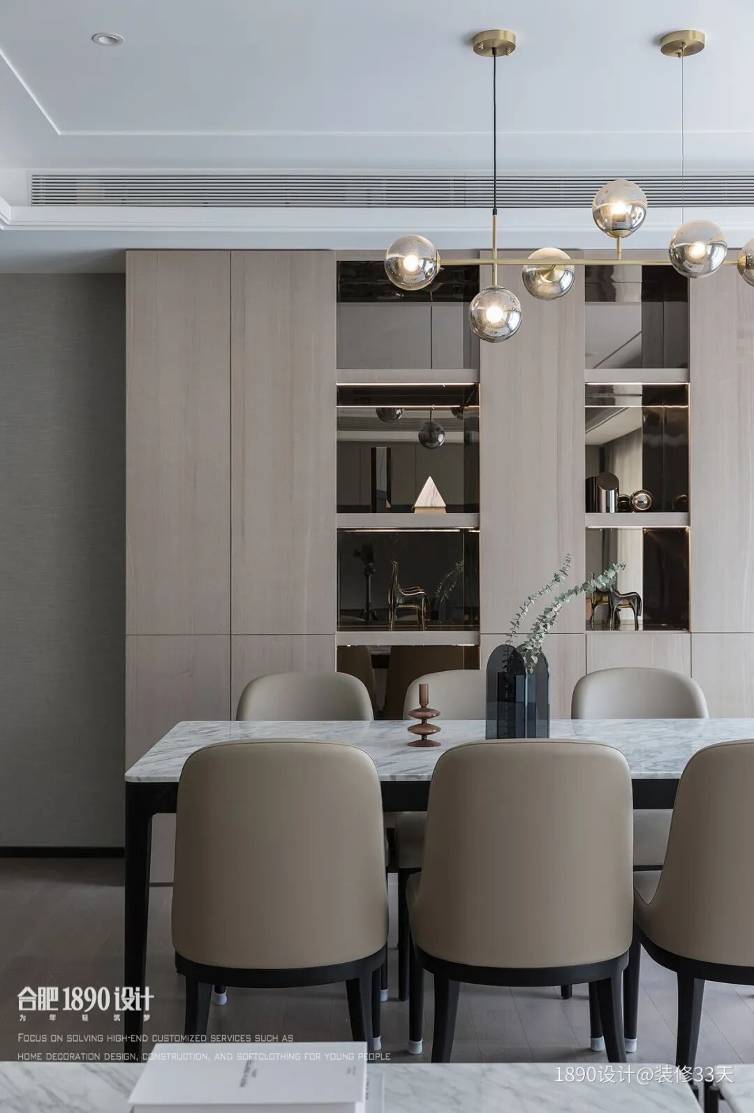 ▲ 餐桌椅材质与客厅沙发、茶几呼应,背景做了半开放式餐边柜,设计不锈钢包边,点缀精致的摆件装饰