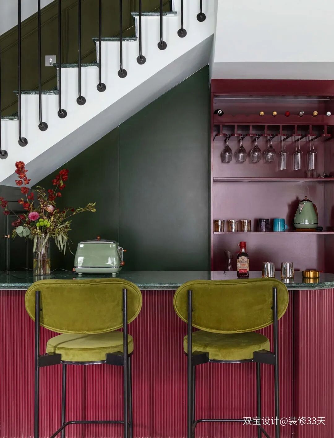 ▲ 空间中的紫红色与墨绿色碰撞出复古美感