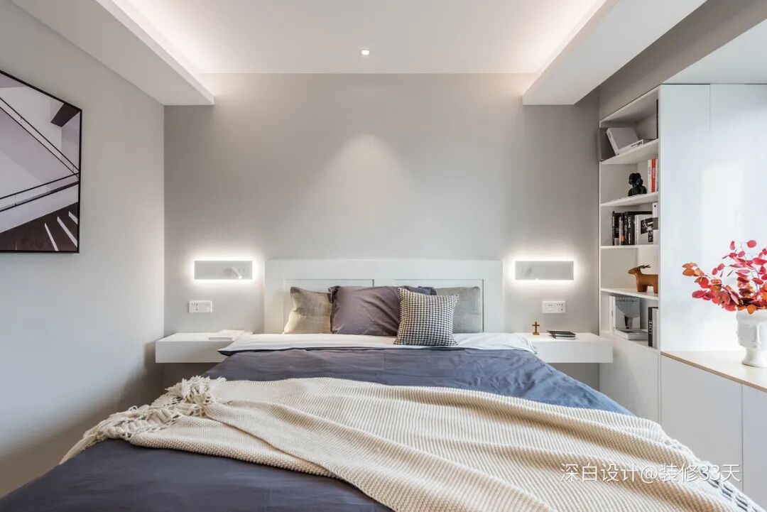 ▲ 注重细节的主卧,做隐藏式灯带设计,灯光通过房顶折射照明,光线柔和而不刺眼,床头一侧因为男业主有睡觉前读书的习惯所以做了书柜,床头灯也可以作为阅读灯使用,方便夜读
