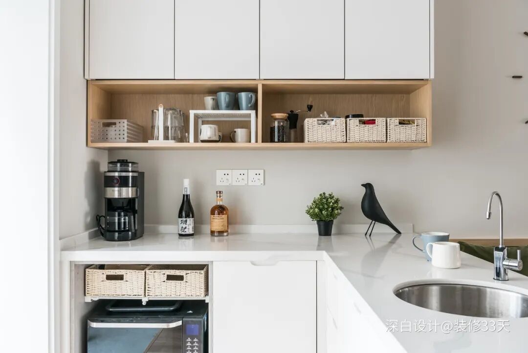 ▲ 橱柜结合岛台设计能够备餐的同时还能满足储物需求,平常喜欢吃的零食都可以放进去,还能放一些餐具,纯白的橱柜结合木色,干净舒服