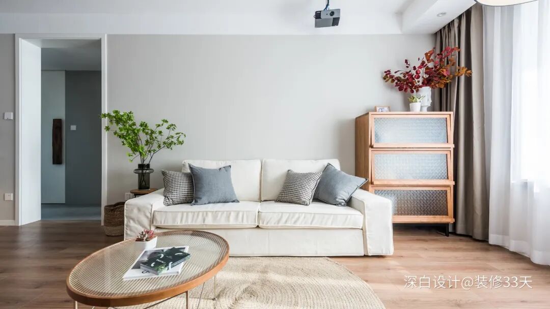 ▲ 将原本朝南的阳台打通,拥有正常尺寸客厅公共区,沙发,单人椅和120寸投影仪,围绕茶几和地毯作为中心延续,家具和材质选择上保持高度一致,沙发和边几造型简约与日系风格大体相近