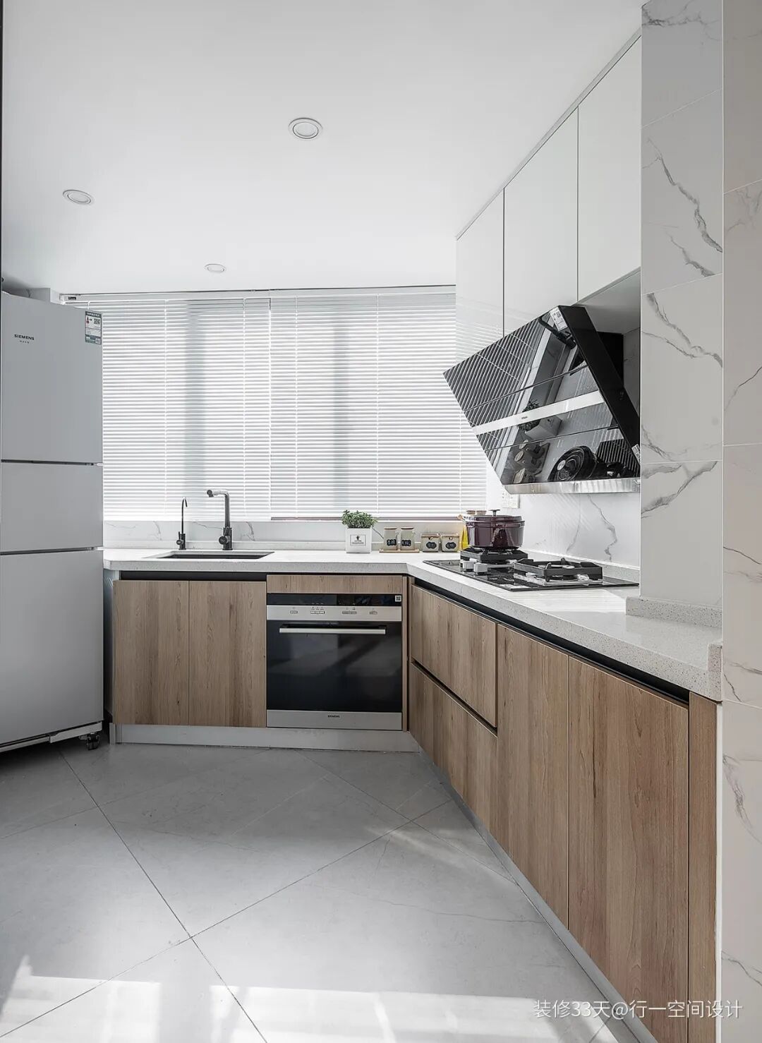 ▲ 厨房,将冰箱放在了异形拐角处,冰箱底部装了轮子,将后面鸡肋空间也得到了很好的利用,厨房从拿-洗-切-烧动线完美