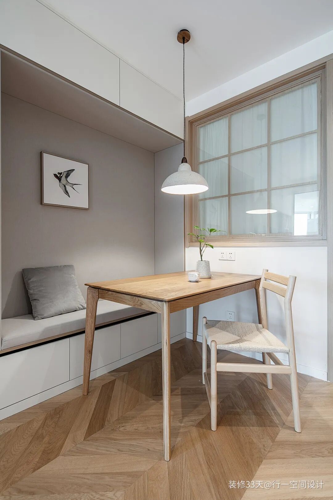 ▲ 餐厅,从电视墙延伸做了一个1.6米长的卡座,上下都能储物,吊柜可以收纳不常用的行李箱