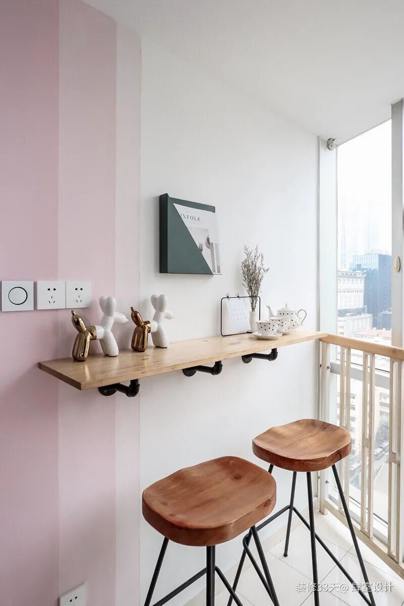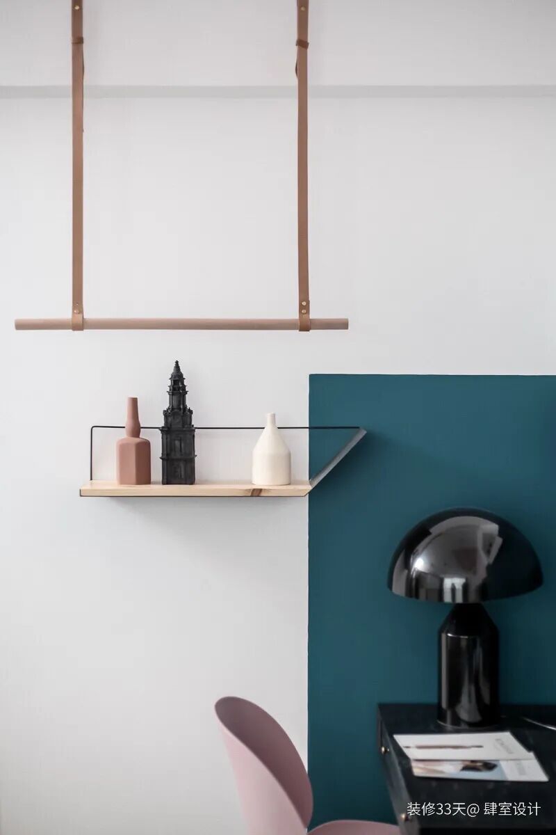 ▲ 墙面增设莫兰迪色铁艺杂志架,漂亮的茶具提升幸福感