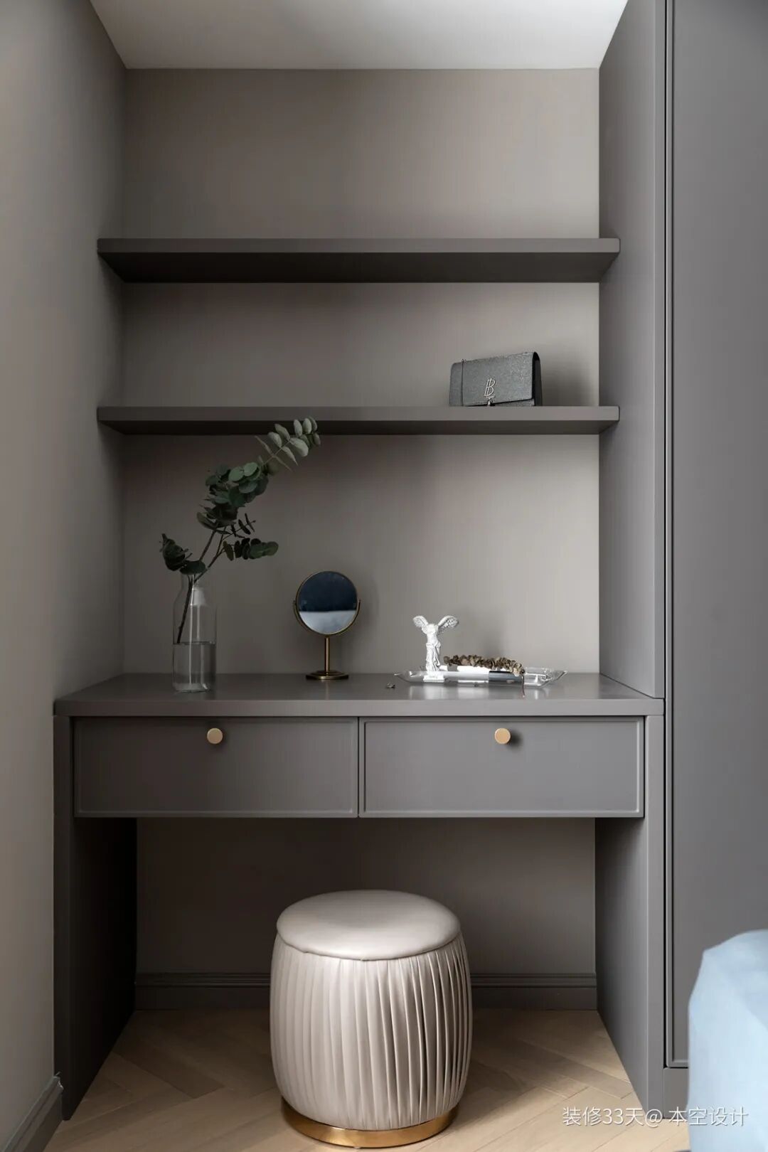 ▲ 利用柜子与墙之间的空间给女主人设计梳妆台,开放式搁板+两个抽屉,让女主的化妆品能够更整齐干净的收纳好