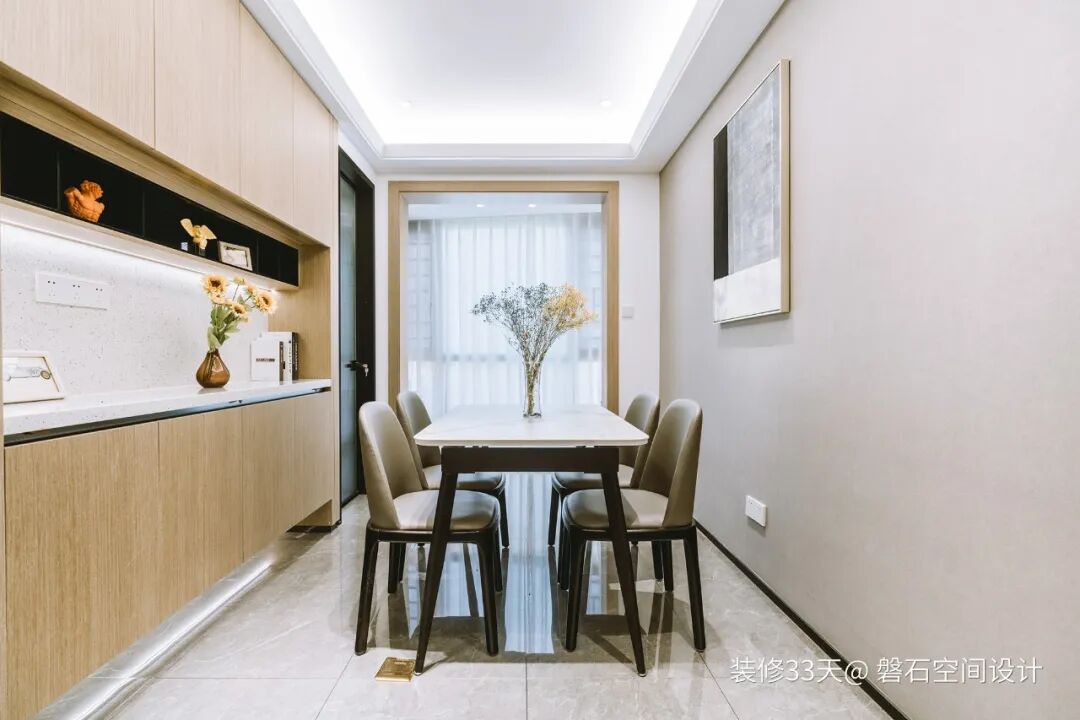 ▲ 餐厅,白色大理石餐桌搭配灰色皮质餐椅,定制分体式餐边柜,既作背景又可储物