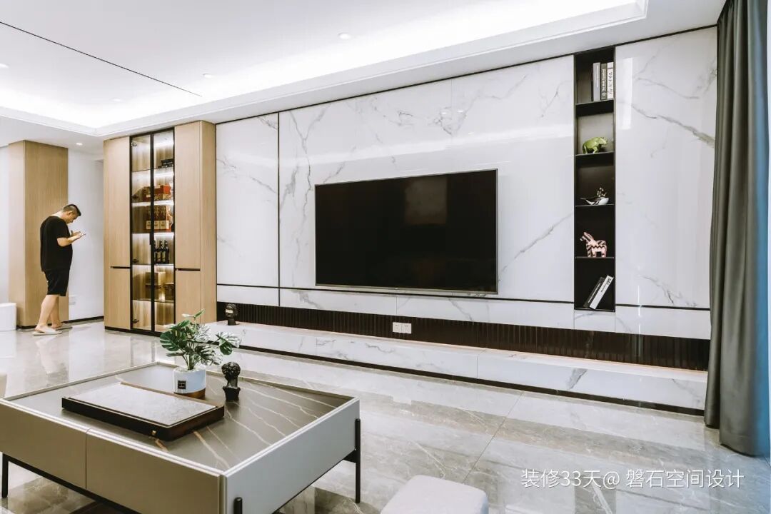 ▲ 白色石材电视墙嵌入黑色开放格,避免太过单调,底部留空设计地台充当电视柜