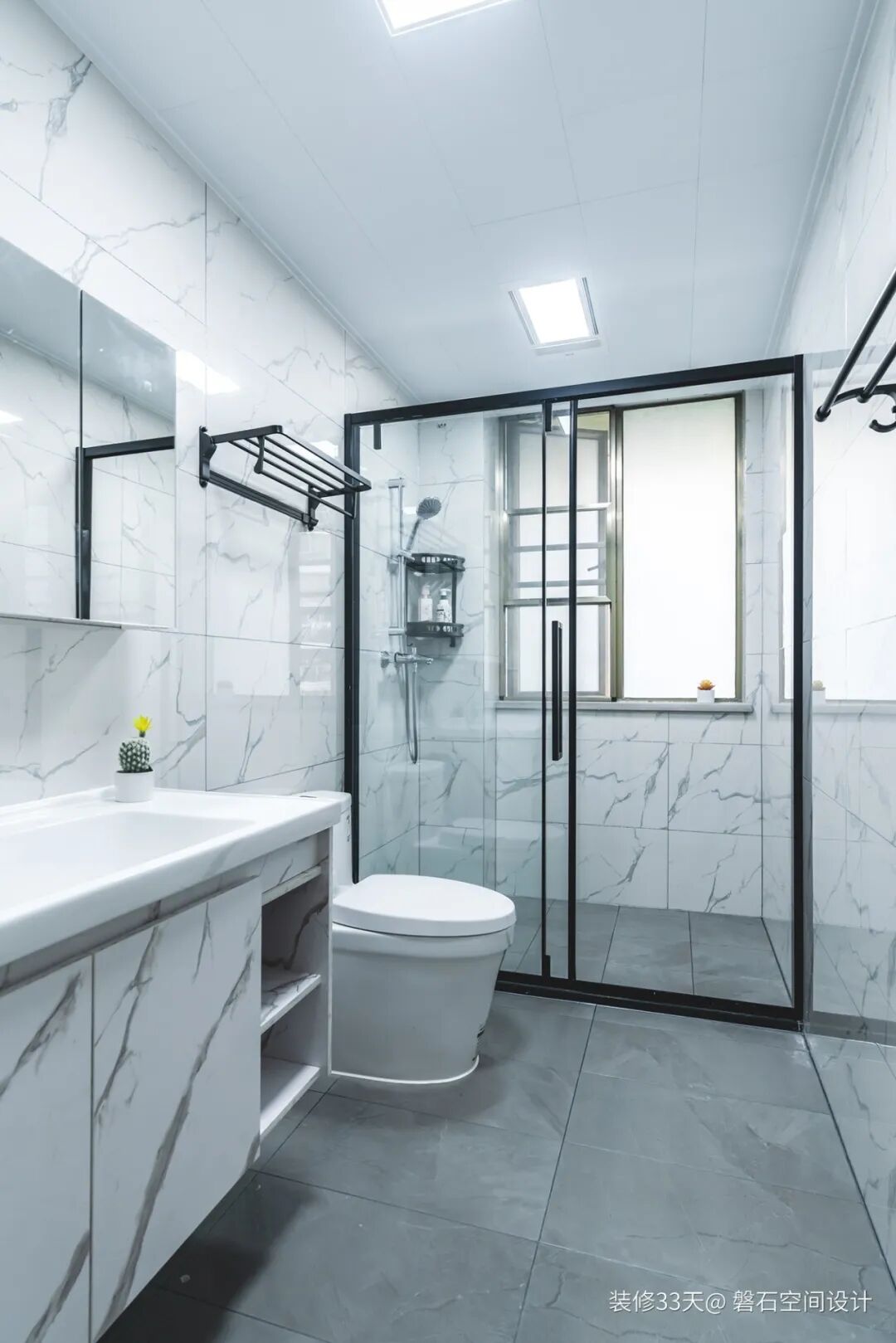 ▲ 次卫,白色石纹墙砖搭配灰色地砖,在通透的玻璃隔断下,更显简约干净