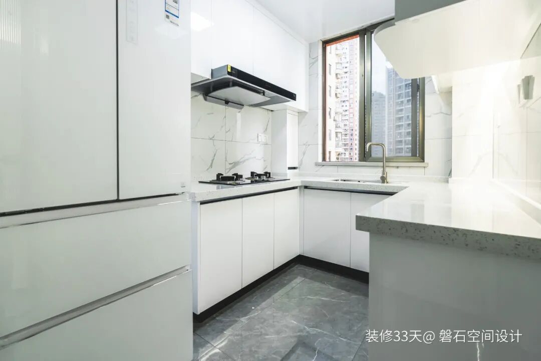 ▲ U型厨房,以白色为主的墙面和橱柜,有扩大空间感的效果