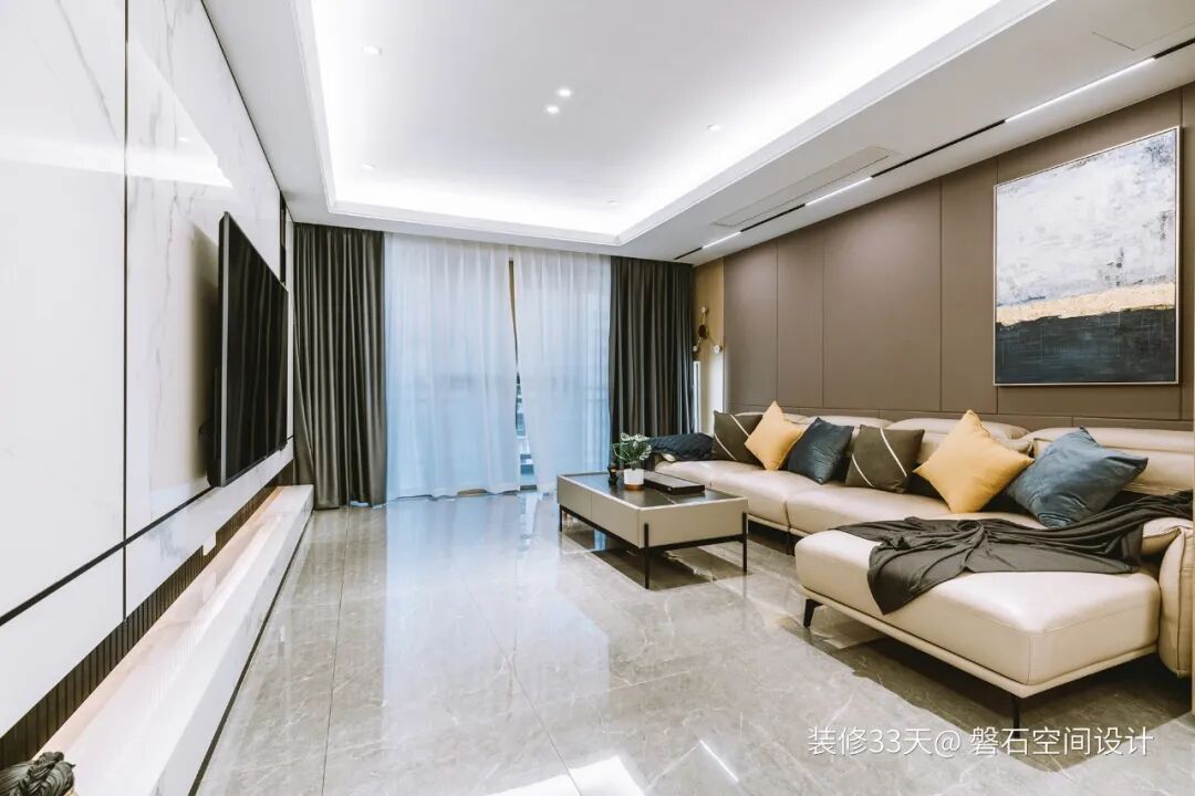 ▲ 客厅无主灯顶面,地面铺贴灰色瓷砖,并与电视背景、沙发背景由浅及深做了完美的过渡
