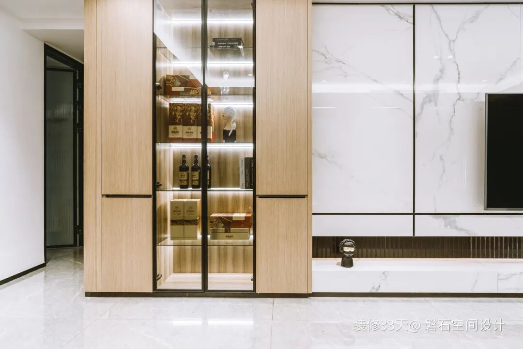 ▲ 电视墙左侧做了一组酒柜做装饰,内置灯带增加高级感和实用性