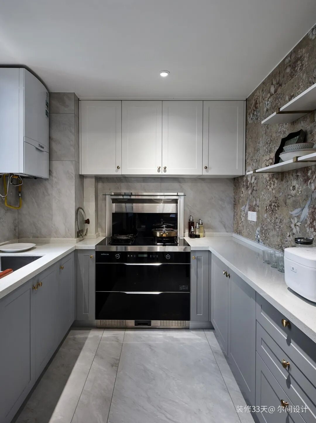 ▲ 厨房U型布局,采用花砖与浅灰色瓷砖相搭,右侧设计双层隔板取代吊柜,让物品一目了然,伸手可得