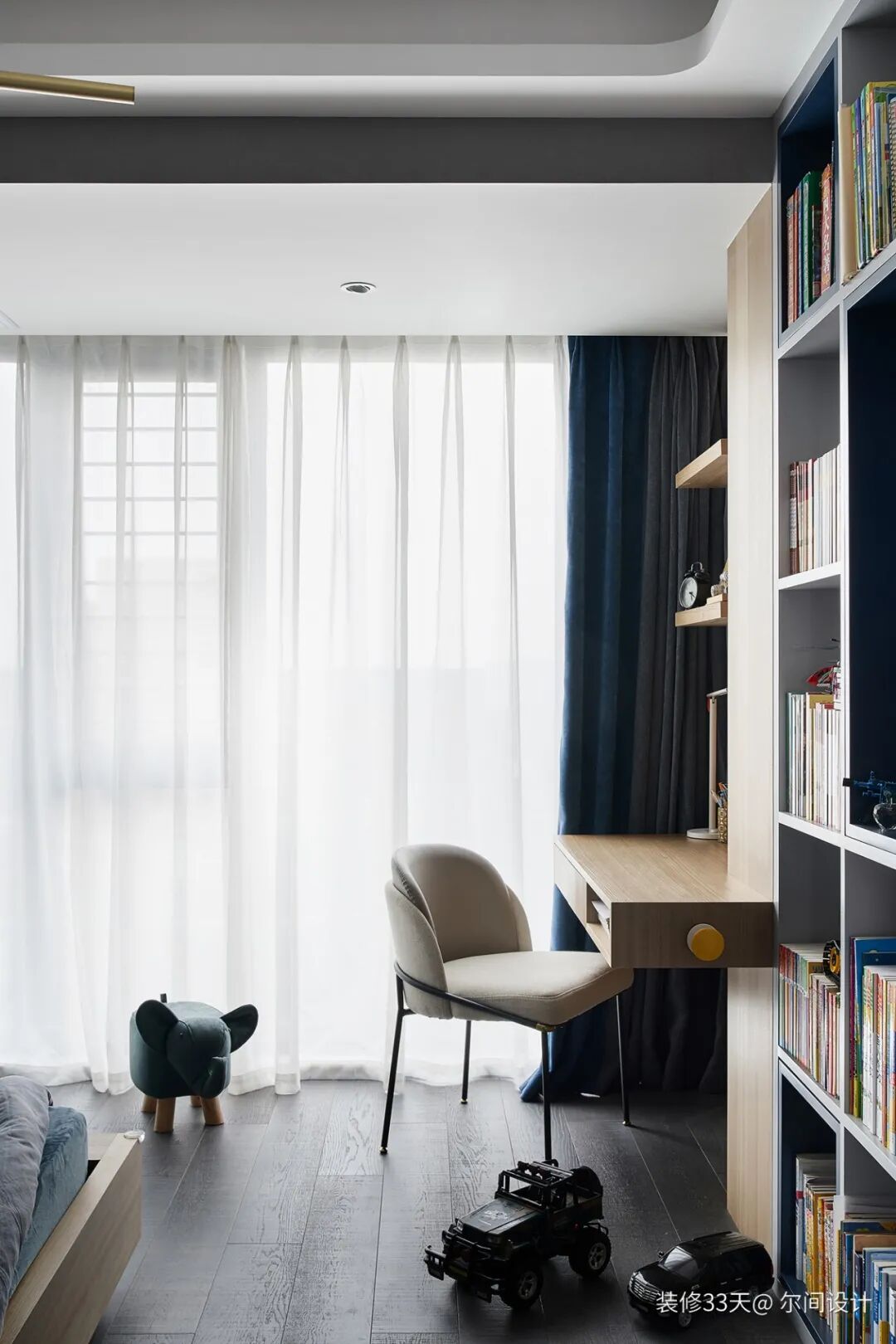 ▲ 多功能房连通儿童房与主卧,书桌柜一体式设计,节省空间