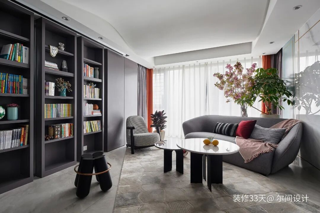 ▲ 客厅打破传统沙发正对电视墙的布局方式,打造收纳型背景墙,半开半合的设计,收纳与展示并存