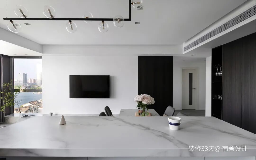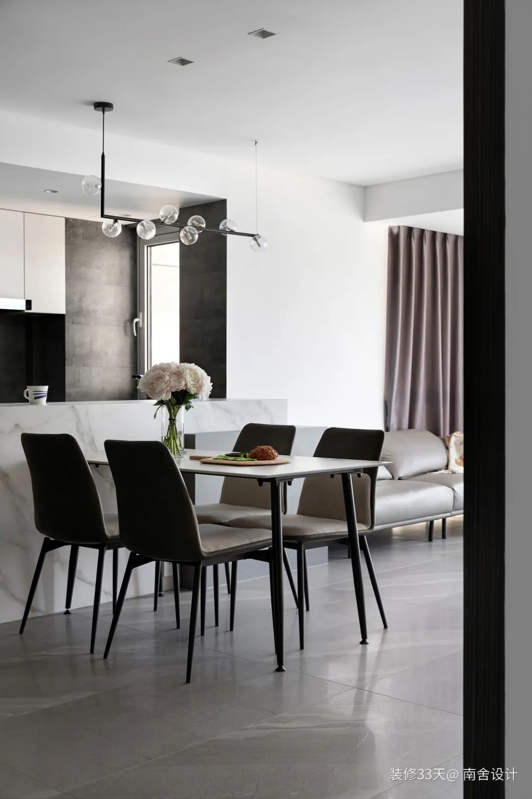 ▲ 餐厅,现代风的餐桌椅依靠间隔餐厨的石质岛台,上方的造型吊灯增加空间层次,营造就餐氛围