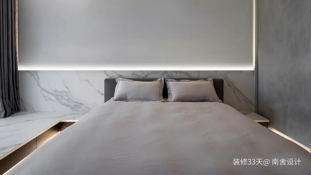 ▲ 主卧,落地窗边的大理石地台延伸至床头,与一侧床头柜连成一体,另一侧床头柜材质造型相呼应,石材床头背景暗藏一条灯光,与地台灯光连成整体,空间色调元素协调统一