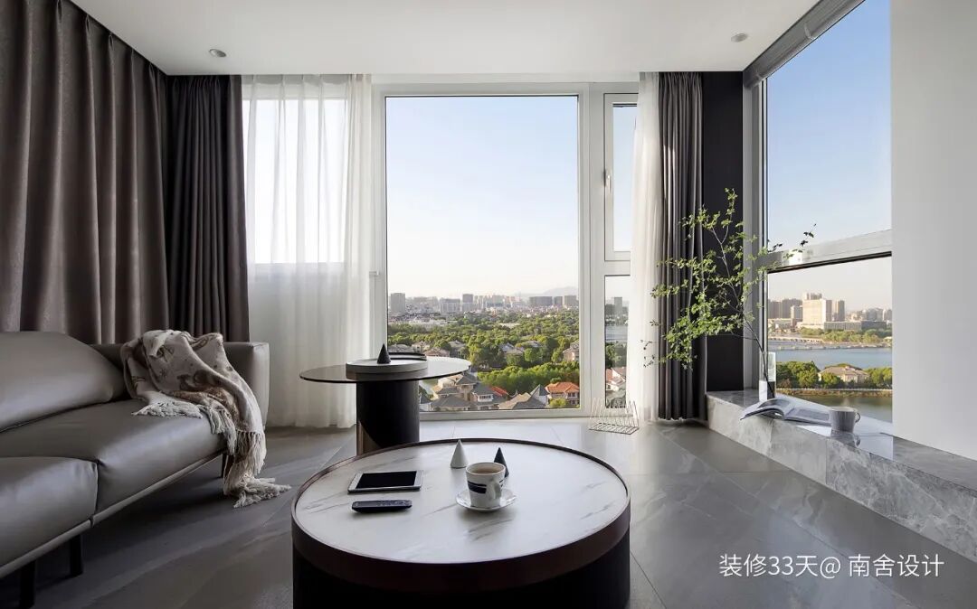 ▲ 客厅,石纹地砖搭配无主灯极简顶面,大面积的落地采光窗,将室外的湖景尽收眼底