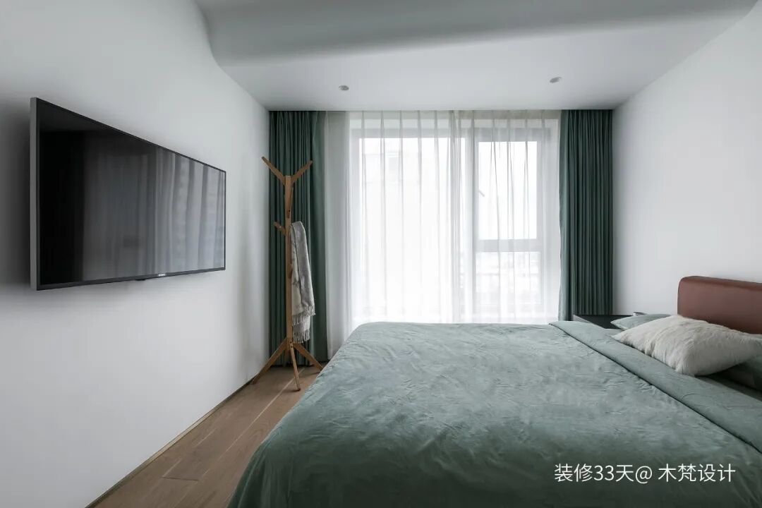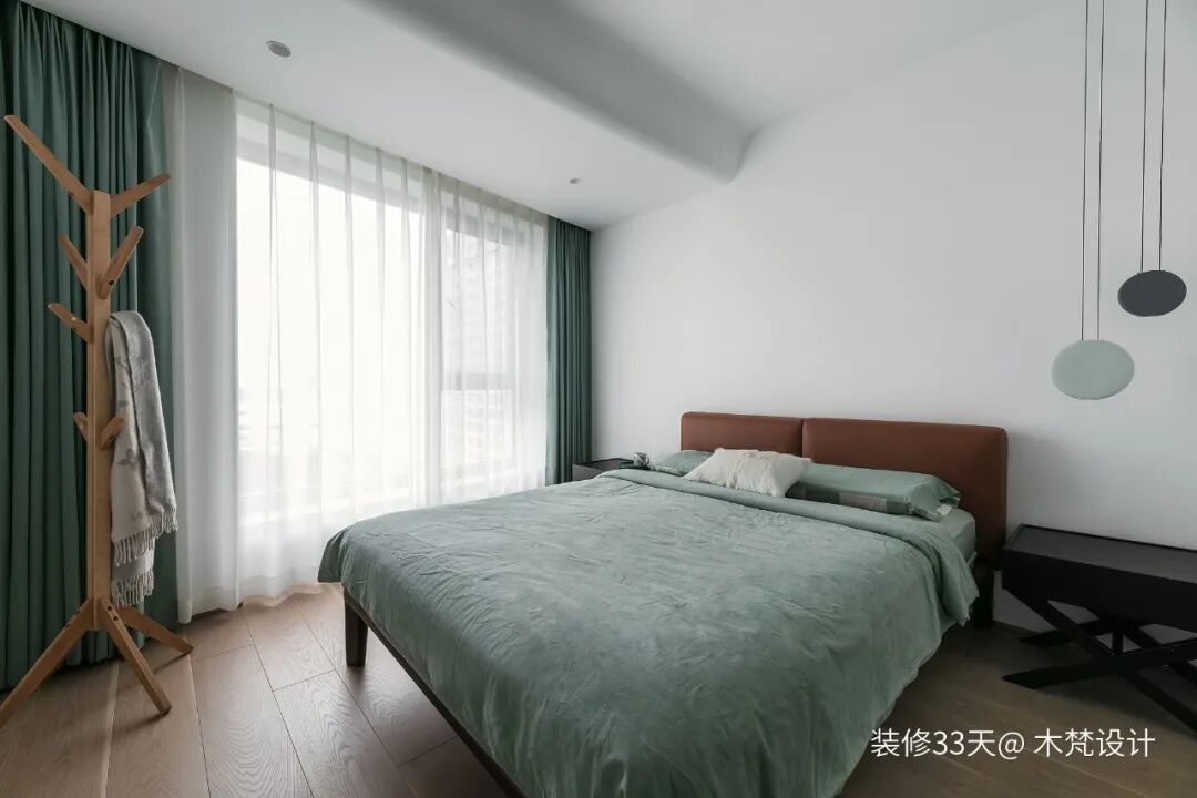 ▲ 主卧保持着简约与精致,不同于起居空间的冷淡灰调,而使用更多木质营造温馨氛围,一抹吸睛的绿色成为空间点缀,巧妙的搭配将质朴与时髦完美融合