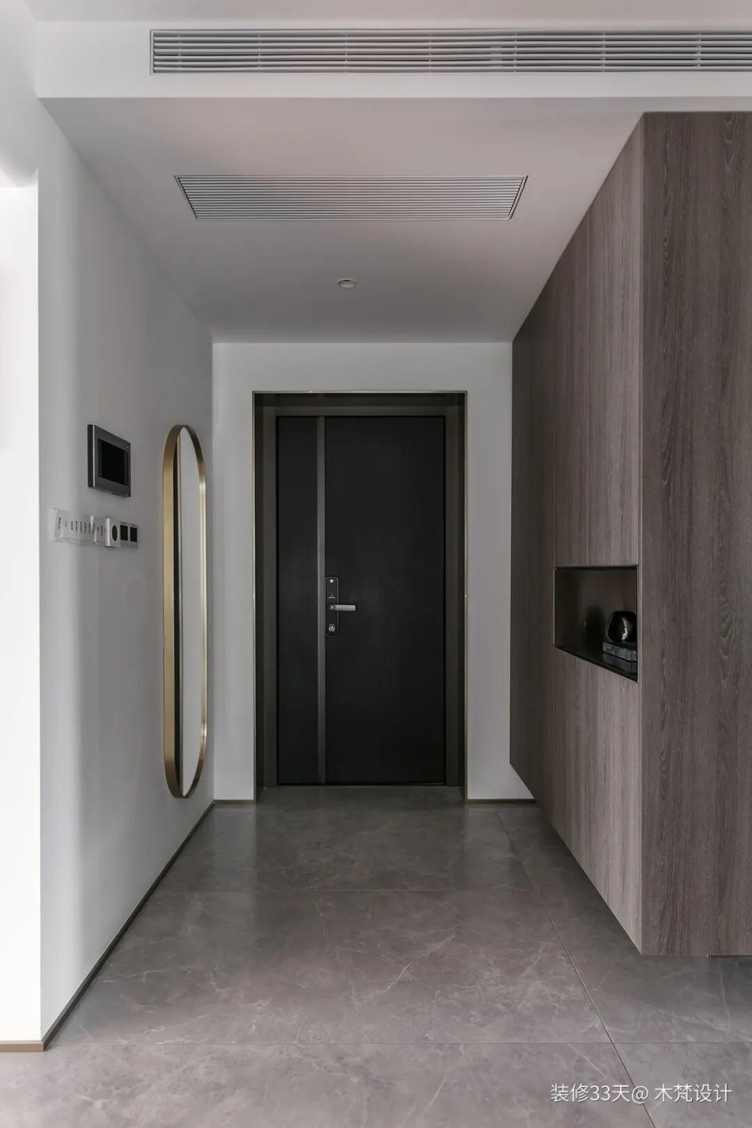 ▲ 入户,一整面墙的胡桃木鞋柜,按压式柜门保持视觉上的统一和极简,底部悬空营造轻盈的空间感,中部留空方便置物,黄铜镶边的穿衣镜,时尚又实用