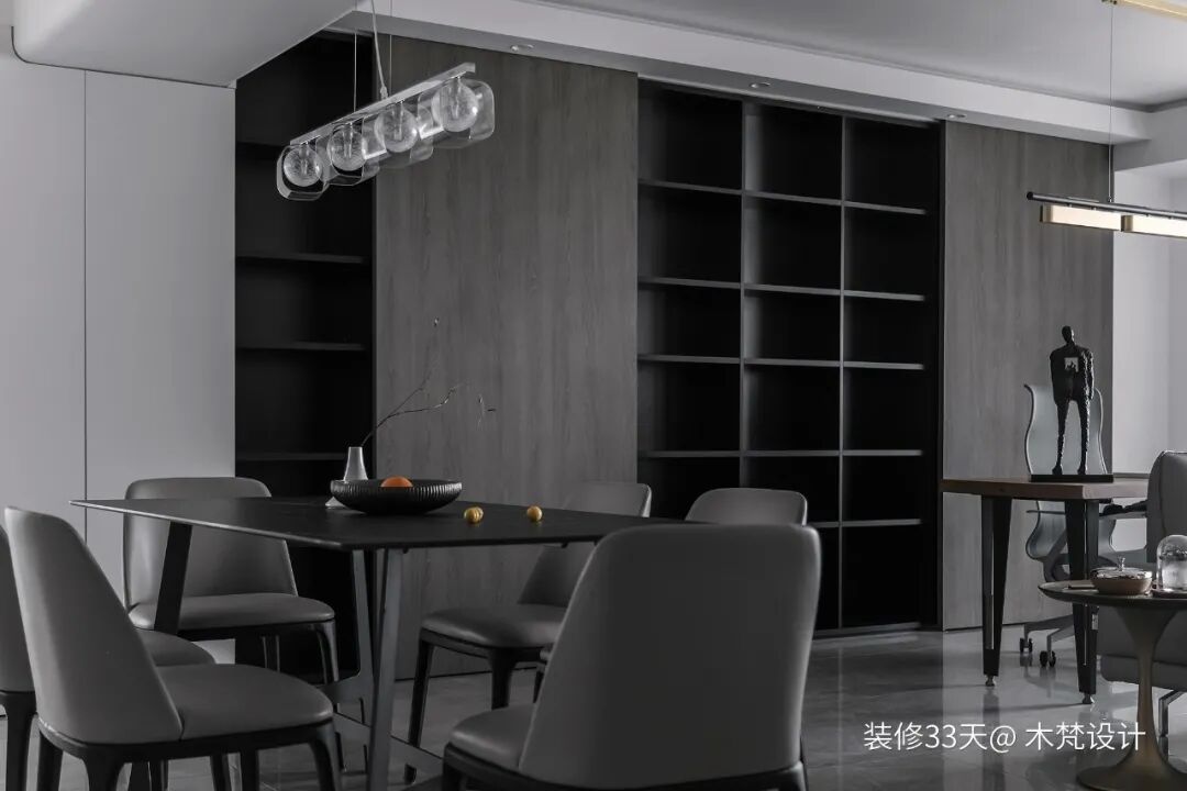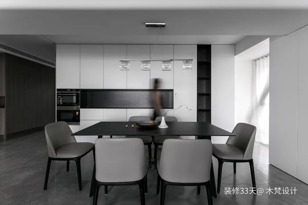 ▲ 餐厅,1.8米的大餐桌可以满足6到8人同时用餐,接待亲朋好友都十分方便,满墙的柜体充分满足日常储物,保持家的整洁清爽,中间的镂空和一侧的开放层架则作为展示区,也可以收纳使用频率较高的日常小物