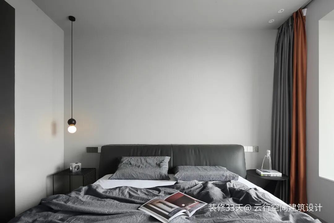 ▲ 留白的背景无任何修饰,一边的床头安装一盏线性吊灯点亮卧室一角,营造温馨氛围