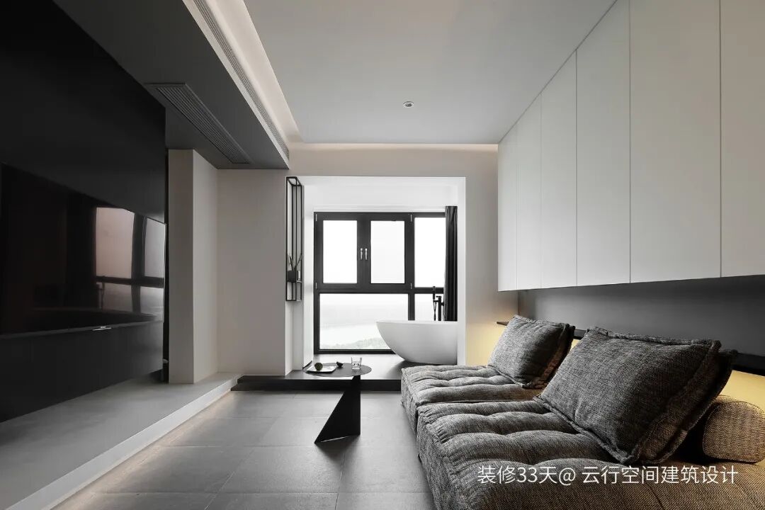 ▲ 电视柜也是悬吊与顶上,有了一种轻盈感,让这个空间变的更加通透