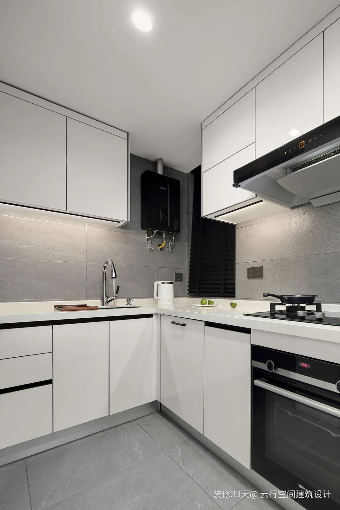 ▲ 厨房,墙地面通铺同款灰色瓷砖,搭配白色橱柜与台面,加入暖色灯光,简洁大气