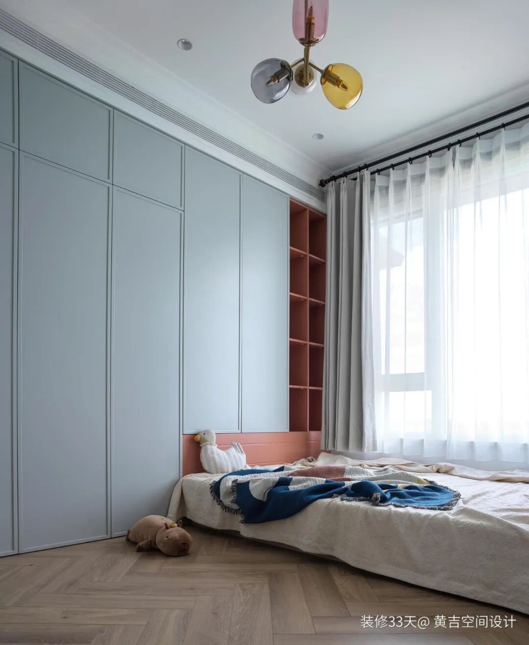 ▲ 儿童房延续人字铺木地板,榻榻米床铺结合整面收纳柜,用不同的色块与柜体的开合设计,丰富空间使用功能与背景内容