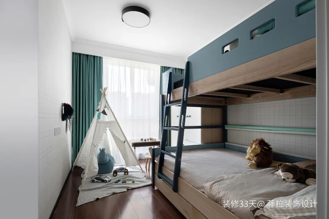 ▲ 儿童房,定制实木高低床环保又实用,靠窗布置帐篷与小书桌