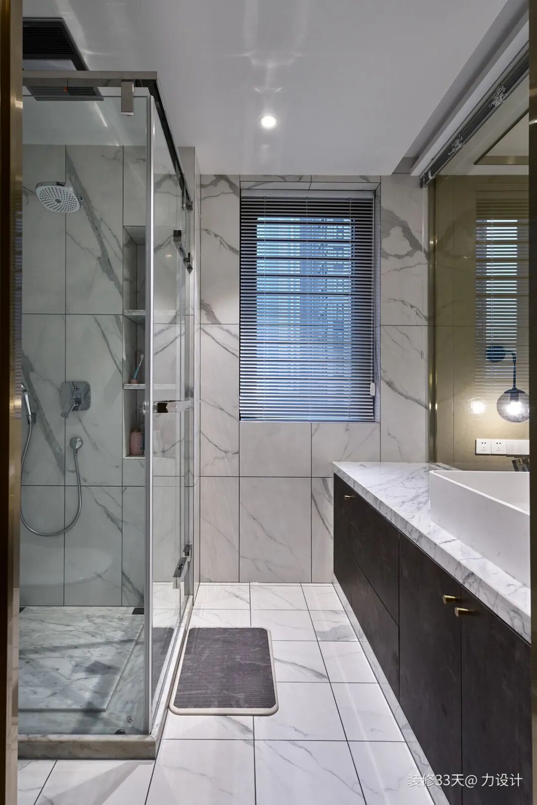 ▲ 主卫,玻璃内侧安装百叶帘确保隐私,淋浴区利用墙面设计壁龛