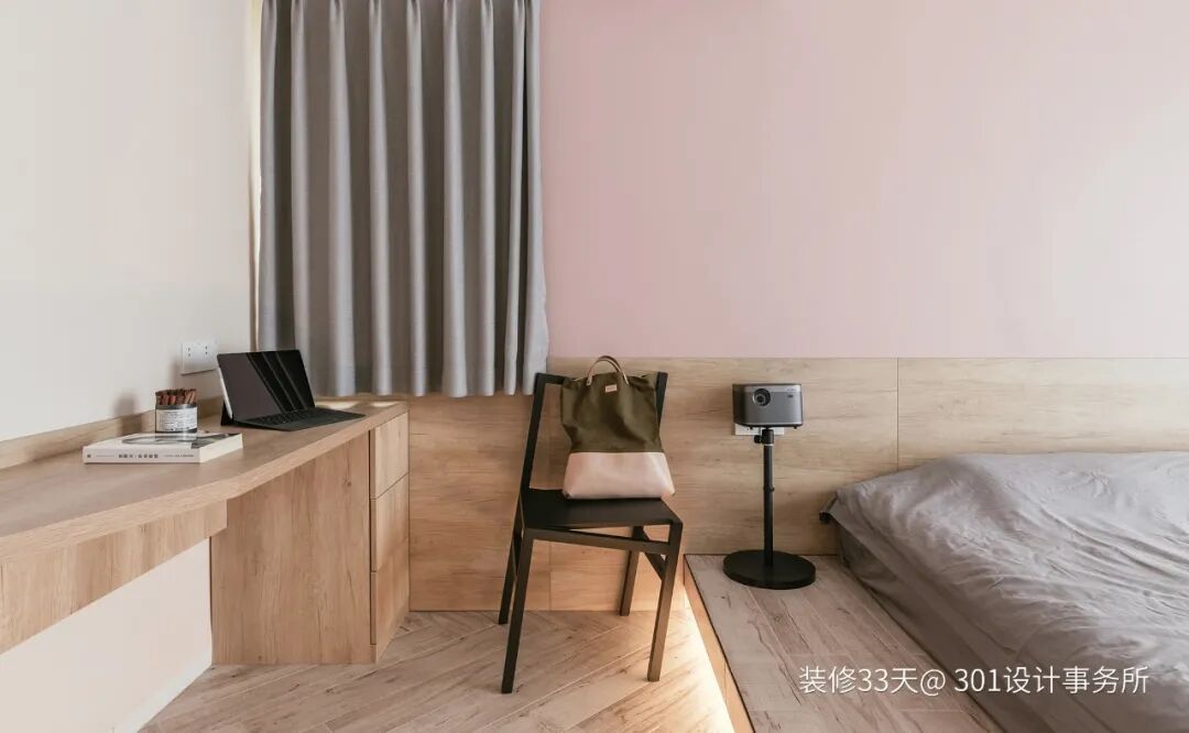 ▲ 儿童房,整体以浅色为主,柜子和床连成一片,柜子中间留出电视墙的功能,白色+粉色+原木,给人轻松温和的视觉体验