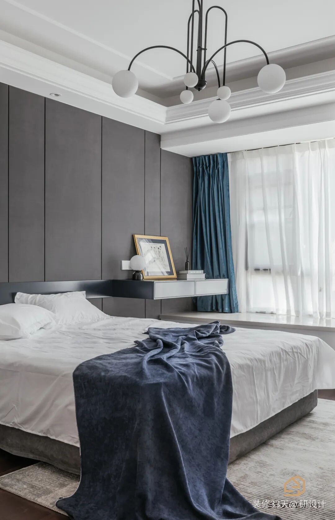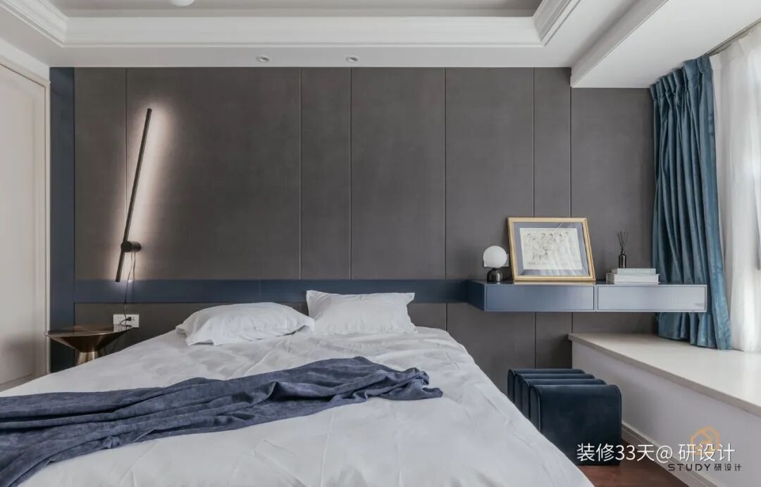 ▲ 主卧以质感的灰色作为主基调,从容不迫,一笔蓝色勾勒出空间的细节