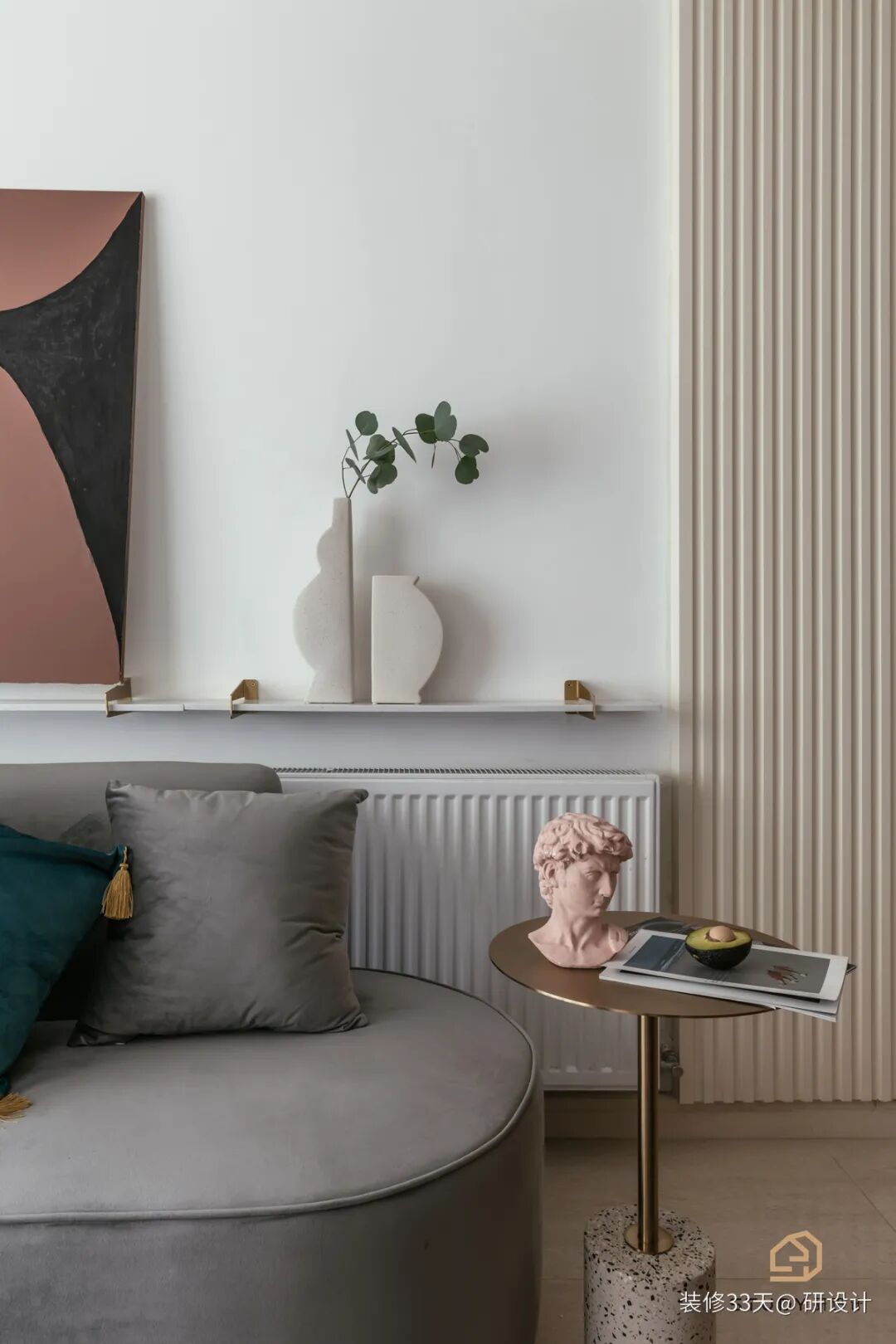 ▲ 保留原有瓷砖地面,地毯、茶几、灯饰、沙发以及装饰画,都采用圆润的线条,勾勒流畅的视觉弧度