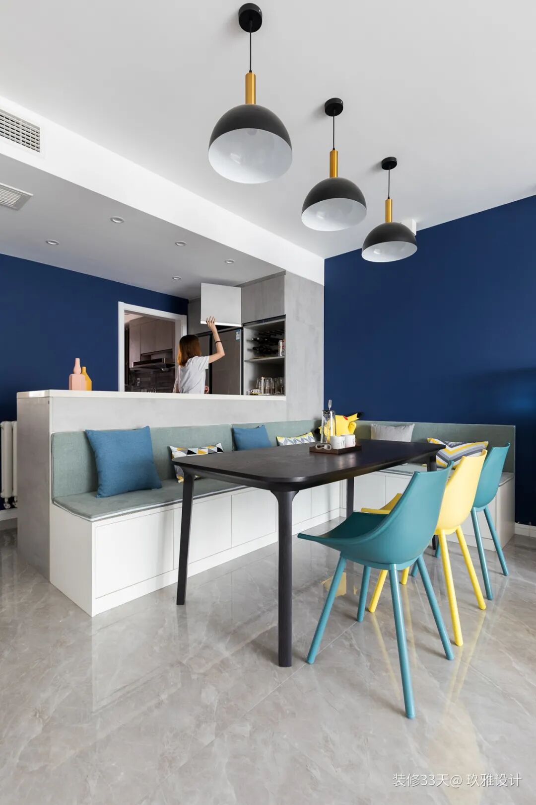 ▲ 餐厅,靠墙设计L型卡座,搭配色彩餐椅,黑色的餐桌与吊灯呼应