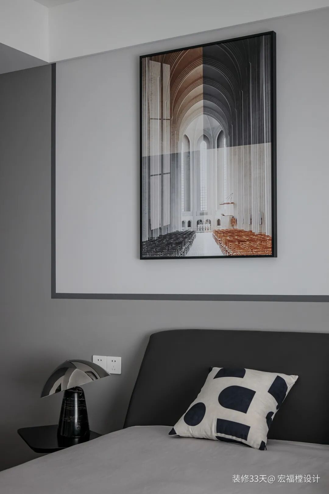 ▲ 考虑到主卧收纳区域不足,拆除沙发背景墙体并前移15厘米,扩大衣柜收纳区域,整体风格延续外部空间的黑、白、灰色系,带来功能性与舒适深邃的空间感受