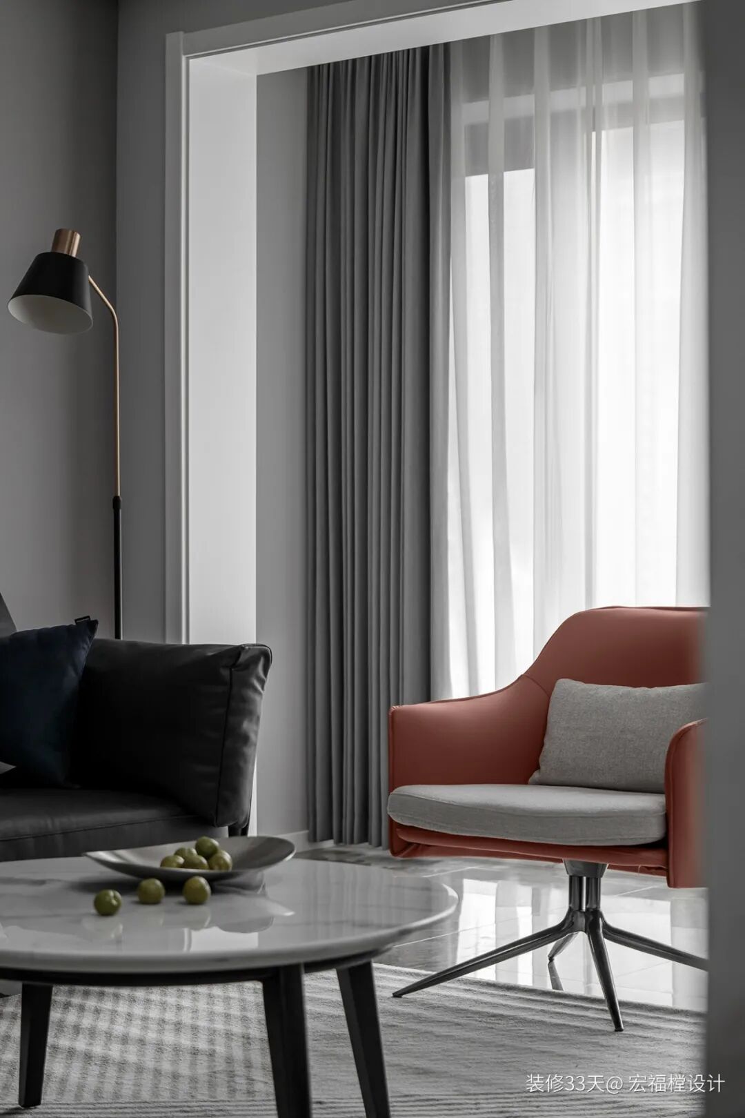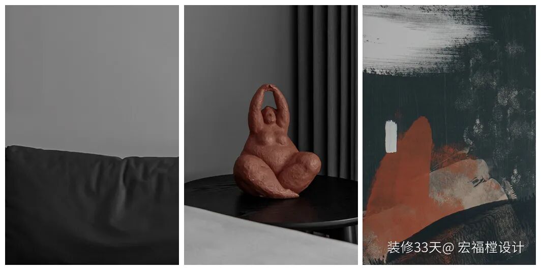 ▲ 黑色真皮沙发搭配橙色单椅,灰色墙面用艺术抽象画点缀,采用色彩分散呼应营造简约不失活力的生活美学
