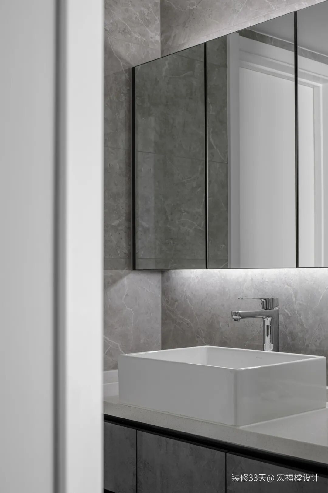 ▲ 卫生间延续低饱和的基调,镜柜缝隙间的光源设计使得空间更有层次感,给人一种低调的舒适体验